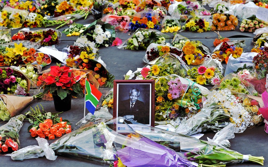 Read moreFlowers left by mourners surround a portrait of Nelson Mandela in the Sandton district of Johannesburg, on December 6, 2013. Mandela, the revered icon of the anti-apartheid struggle in South Africa and one of the towering political figures of the 20th century, died on December 5, aged 95. #