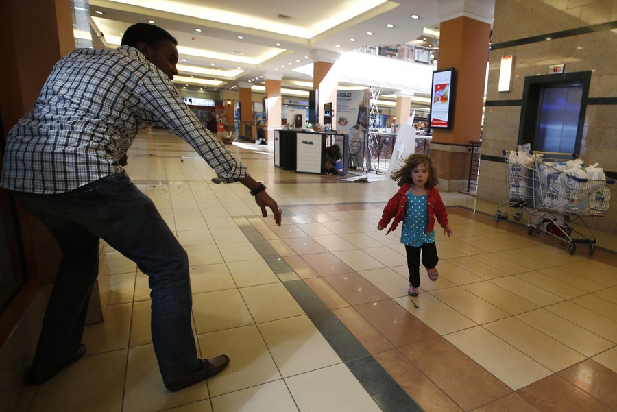 Read moreA child runs to safety as armed police hunt gunmen who went on a shooting spree at Westgate shopping center in Nairobi, Kenya, on September 21, 2013. The gunmen, reportedly associated with the Islamist group al-Shabaab, stormed the shopping mall, killing at least 72 people, and sending scores fleeing into shops, a cinema and onto the streets in search of safety. #