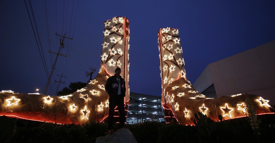 Read moreAdam Lopez passes a giant pair of boots outside North Star mall, in San Antonio, Texas, on December 5, 2013. The 40-foot tall boots are decorated with holiday lights annually. #