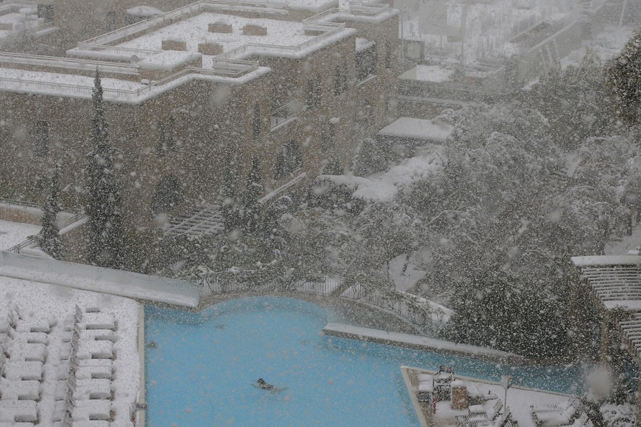 Read moreA woman swims in the pool at the David Citadel Hotel during a snow storm in Jerusalem, on December 13, 2013. The snowstorm of rare intensity blanketed the Jerusalem area, choking off the city and stranding hundreds in vehicles on impassable roads. #