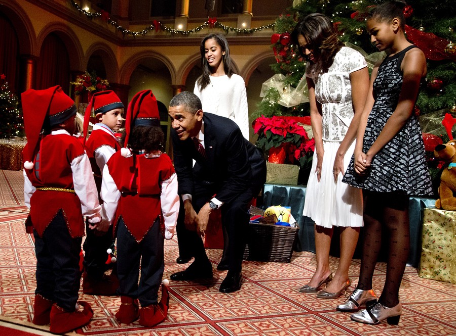 Read moreThe first family, from left, President Barack Obama, Malia Obama, first lady Michelle Obama, and Sasha Obama greet children dressed like elves at the National Building Museum in Washington, on December 15, 2013. The first family was attending the taping of the annual 2013 Christmas in Washington, celebrating its 32nd year anniversary. #