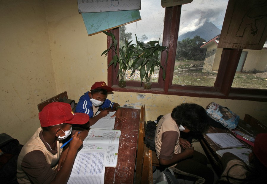 Read moreElementary school students wear masks to protect them from volcanic ash from Mount Sinabung, seen in the background, in Sukan Debi, North Sumatra, on November 26, 2013. #