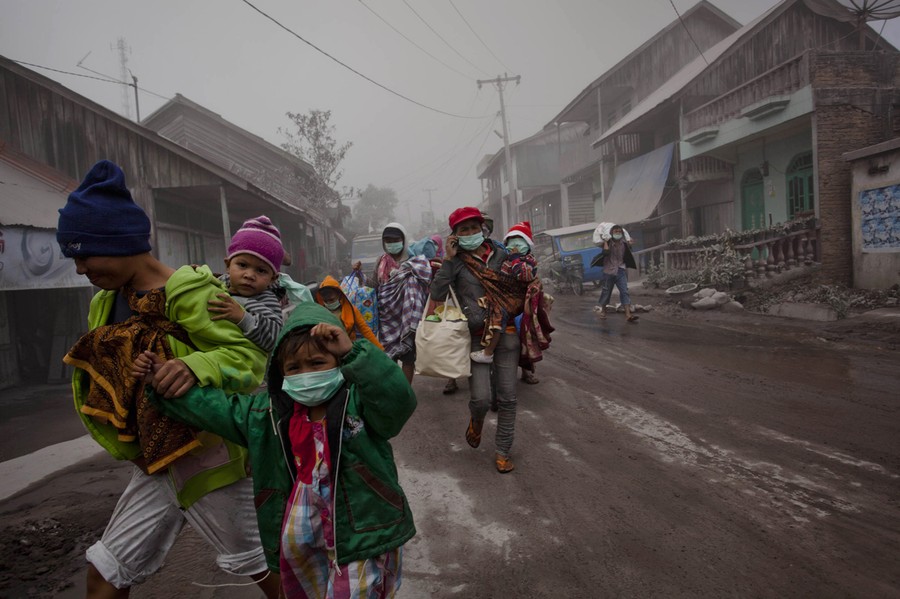 Read moreWomen carry their children as they are evacuated to a temporary evacuation center after their village was hit by ash from Mount Sinabung in Payung village, on January 8, 2014. #