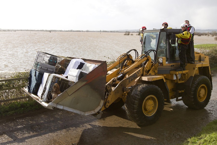 Read moreDevon and Somerset Fire and rescue service evacuate 16 Basset Hound dogs and a similar number of cats near flood waters on a digger in Burrowbridge on February 9, 2014. #