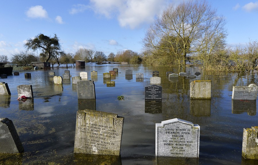 Read moreA graveyard sits underwater in the village of Moorland, on February 7, 2014. Many areas of the Somerset Levels have been underwater for over a month in the wettest January in Britain on record. Severe weather warnings for rain and gale force winds have been issued for the weekend. #