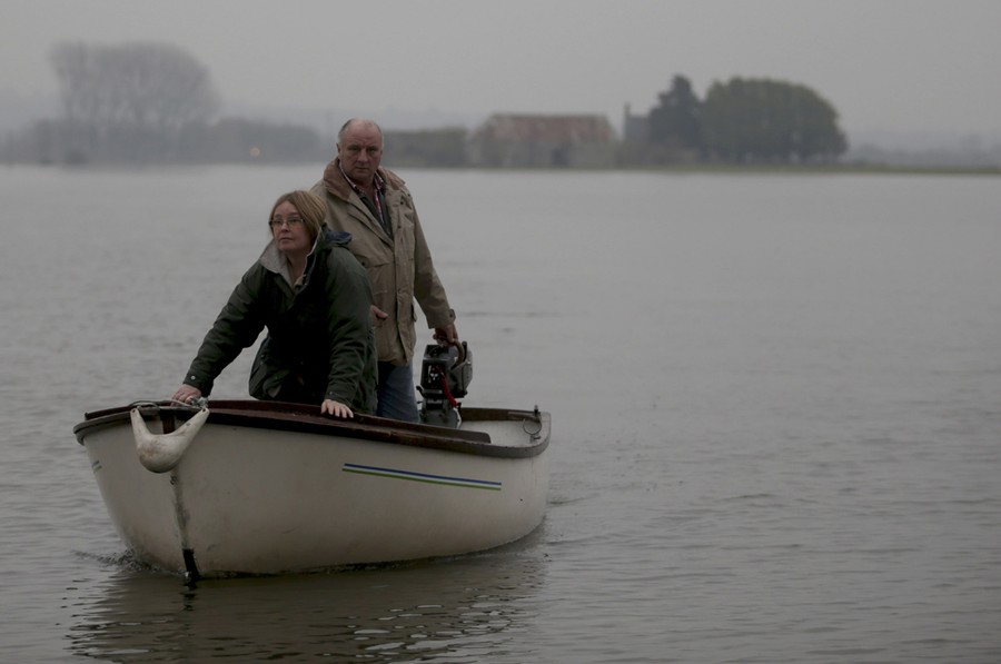 Read moreFarmer Roger Forgan and his partner Linda Maudsley use a boat to cross farm land to get from their farm (pictured behind) which has been cut off by flood waters near the village of Muchelney on January 30, 2014. #