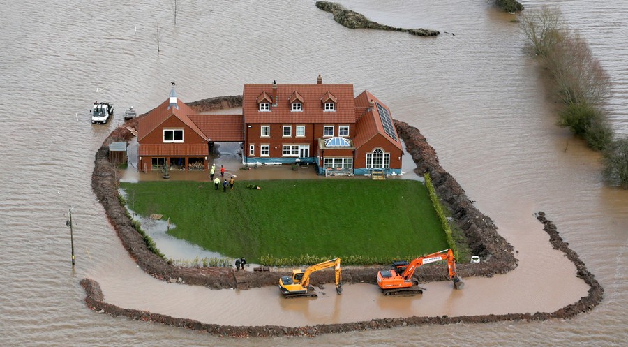 Read moreWorkers continue to build flood defenses around the home of Sam Notaro in the flooded village of Moorland on the Somerset Levels on February 10, 2014 in Somerset, England. Thousands of acres of the Somerset Levels have been under water for weeks, yet flood levels are still rising and worryingly, more rain is forecast for later this week. #