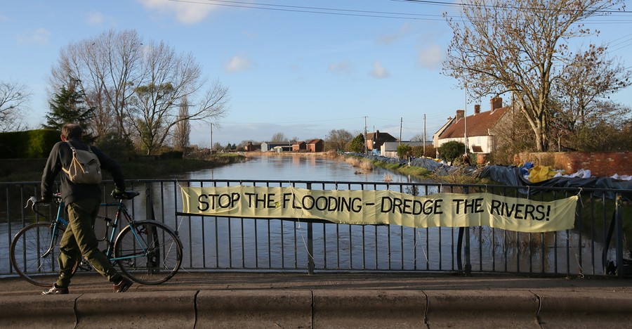 Read moreA cyclist crosses a bridge where locals have put up a sign "Stop the Flooding - Dredge the Rivers" on the River Parrett, at Barrow Mump, in Somerset, on February 2, 2014. Some residents blame the flooding on government budget cuts and environmental bureaucracy. Others point to climate change. Even plump, endangered water voles are the target of ire. #
