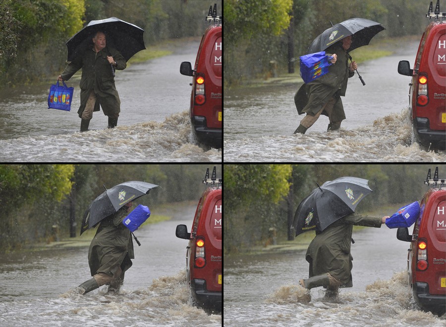 Read moreA combination photo shows an angry resident hitting a vehicle he claims was driving too fast through floodwaters, in the village of Thorney on the Somerset Levels, on January 31, 2014. #