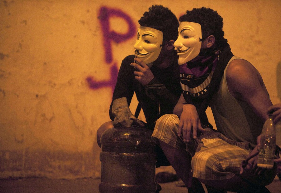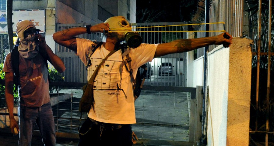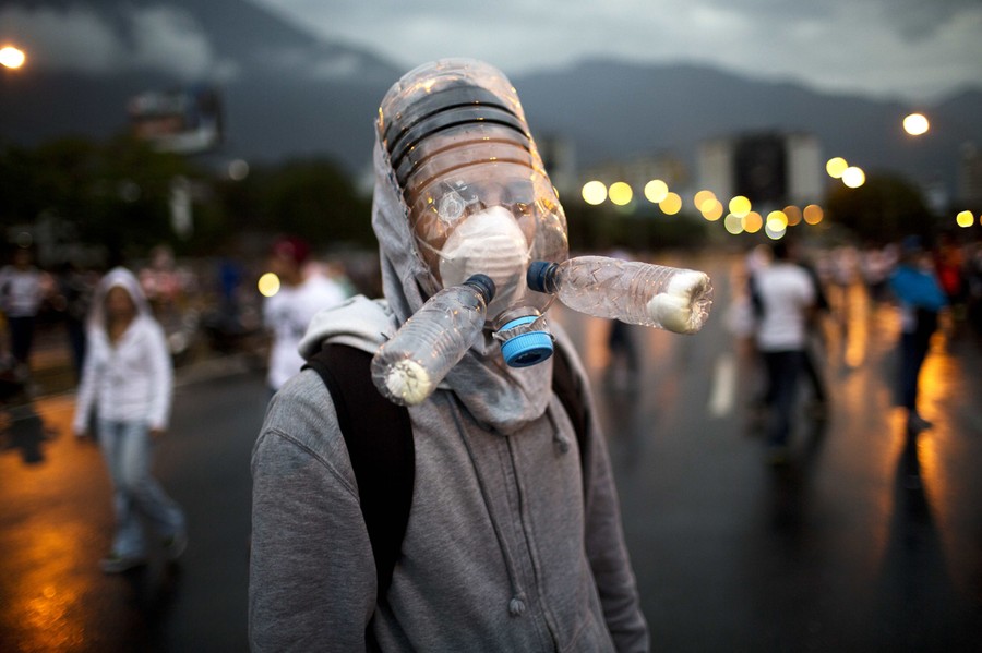 Read moreA protester wearing a gas mask made from plastic water bottles, during an opposition protest blocking a highway outside La Carlota airport in Caracas, on February 18, 2014. #