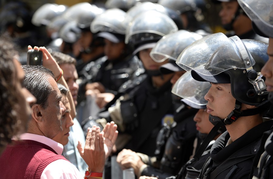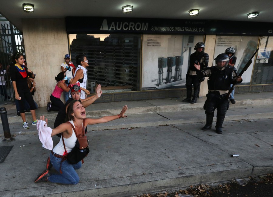 Read moreMembers of the national police confront demonstrators during a protest in Caracas, on February 22, 2014. Hundreds of thousands of Venezuelans took to the streets of Caracas in marches for and against Maduro's government, as the nation's massive divide became ever more evident. #
