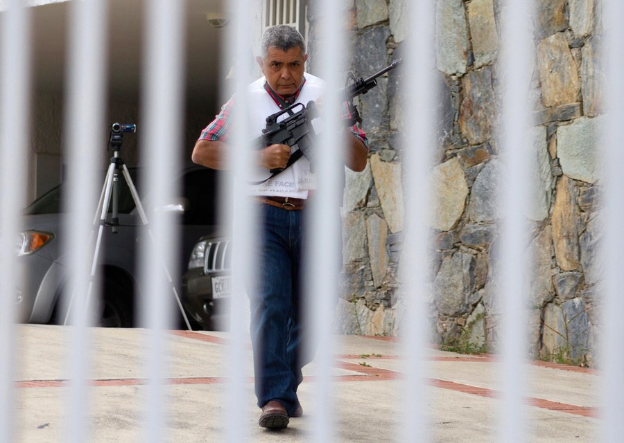 Read moreRetired Venezuelan Army General Angel Vivas, armed and wearing a flak jacket, walks on his property in Caracas, on February 23, 2014, after President Maduro ordered his arrest. Vivas has been an opponent of the Venezuelan government since his 2007 resignation as director of the Ministry of Defense Engineering, due to the military's adoption of the slogan "Fatherland, socialism or death, we shall overcome," created in Cuba. #