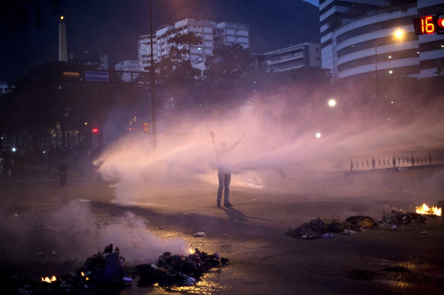 Read moreA demonstrator stands with his arms up as a water canon sprays him and tear gas spills onto the street, fired by the National Bolivarian Police (BNP), in Plaza Francia in Caracas, on February 19, 2014. #