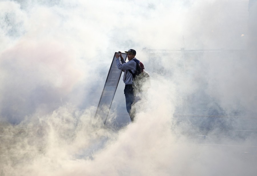 Read moreIn Caracas, Venezuela, a demonstrator holds a street sign to shield himself as he stands amid a cloud of tear gas during a protest against the government of President Nicolas Maduro, on February 22, 2014. Starting earlier this month as a student-led protest against a lack of security, high inflation, and more, the protests have grown into a broad anti-government movement seeking the ouster of Maduro -- sometimes meeting violent resistance, resulting in at least 13 deaths. #
