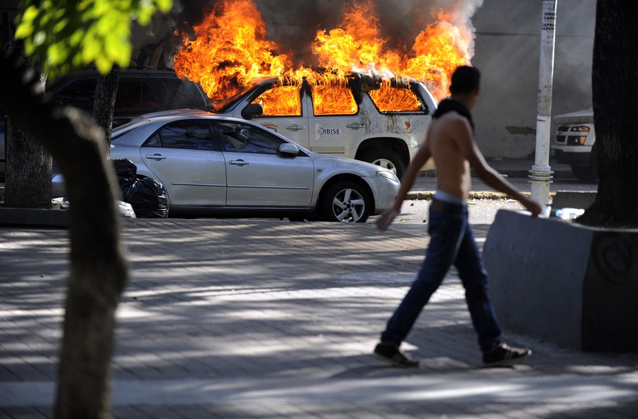 Read moreA student passes by burnt CICPC (Scientific Police) cars during a demonstration against the government in Caracas, on February 12, 2014. Unidentified assailants on a motorcycle fired into a crowd of anti-government protesters, leaving at least two people wounded and a pro-government man dead. #