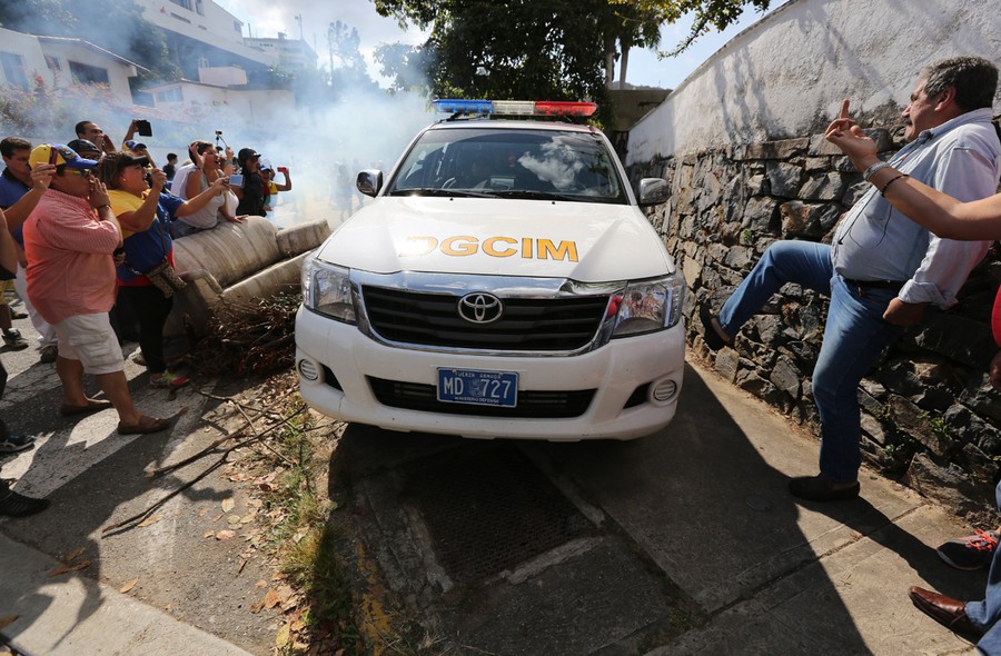 Read moreOpposition leader Leopoldo Lopez enters a National Guard armored vehicle in Caracas, on February 18, 2014. Lopez, wanted on charges of fomenting deadly violence, handed himself over to security forces, Reuters witnesses said. #