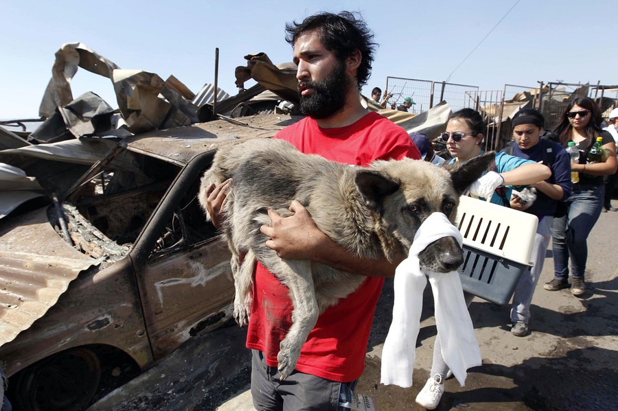 Read moreA resident carries an injured dog through a burned area of Valparaiso on April 13, 2014. #