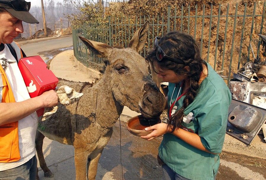 Read moreA volunteer gives a donkey water in an area where a fire swept through, in Valparaiso city, on April 13, 2014. #