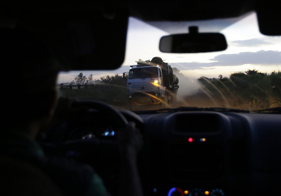 Read moreA truck carries logs along a dirt road leading out of the Alto Turiacu Indian territory, as seen from inside a vehicle belonging to the Ka'apor Indian tribe on August 2, 2014. #