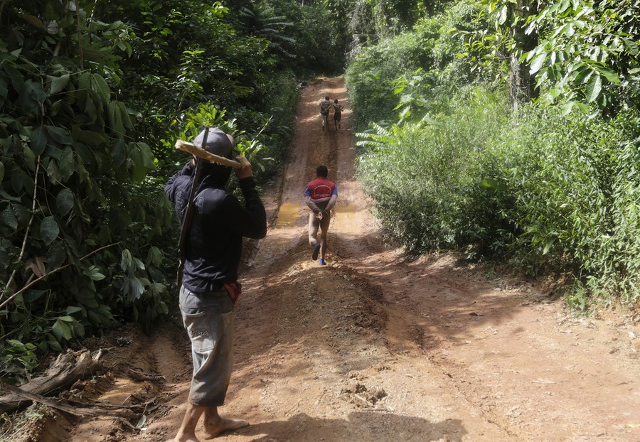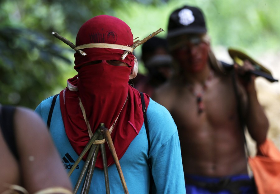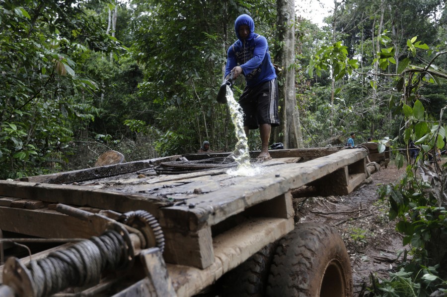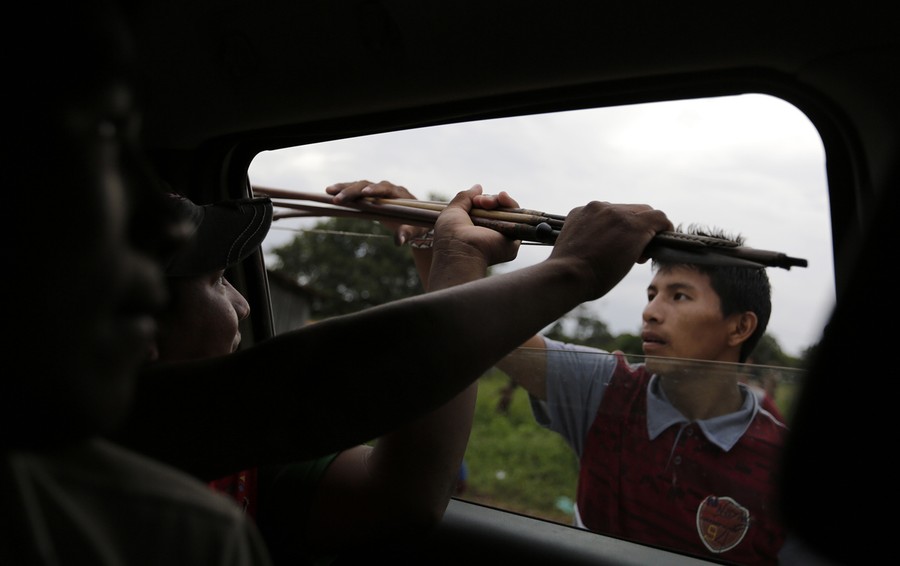Read moreKa'apor Indians hand bows and arrows to tribal warriors traveling by truck through their village of Ximborenda, on the way to search for and expel loggers in the northeast of Maranhao state on August 6, 2014. #