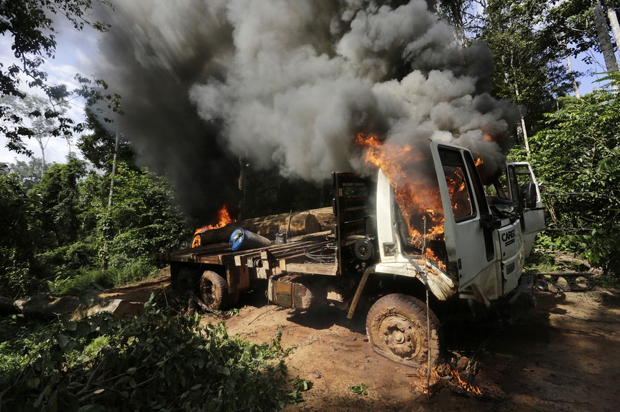 Reuters photographer Lunae Parracho recently went on a search and destroy mission in the Amazon with Brazil's Ka'apor Indians. Frustrated by the government's lack of action to keep illegal loggers out of the Alto Turiacu Indian territory, local warriors from several tribes have taken it upon themselves to find logging camps, destroy equipment, and drive out the unwelcome intruders. Parracho documented the scene as Ka'apor warriors captured a number of men in the forest, burned their trucks, destroyed their logs, then sent their captives down the road—freed, but without shoes or pants, their hands still bound. The Ka'apor Indians and four other tribes—the legal inhabitants and caretakers of the territory—have also set up monitoring camps in areas that are being illegally exploited.