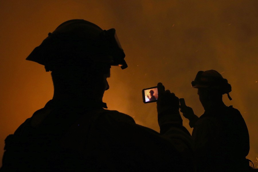 Read moreFirefighters take pictures with their mobile phones as they monitor a backfire while battling the King Fire on September 17, 2014 in Fresh Pond, California. Fire crews in California's rugged Sierra Nevada battle to gain the upper hand on against a blaze that threatens at least 2,000 homes and has displaced hundreds of residents as flames roared for a fifth day through dry timber and brush west of Lake Tahoe. #