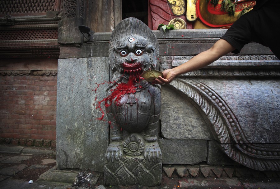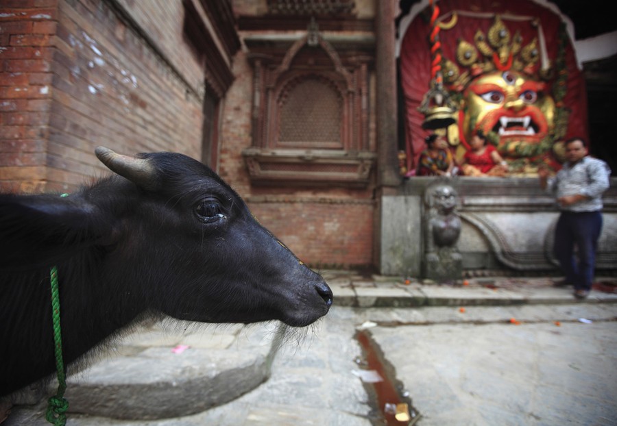 Read moreA water buffalo is kept in front of an idol of "Swet Bhairab" before it is sacrificed, during the Indra Jatra Festival in Kathmandu on September 27, 2012. The annual festival, named after Indra, the god of rain and heaven, is celebrated by worshiping, rejoicing, singing, dancing and feasting in Kathmandu Valley to mark the end of monsoon season. #