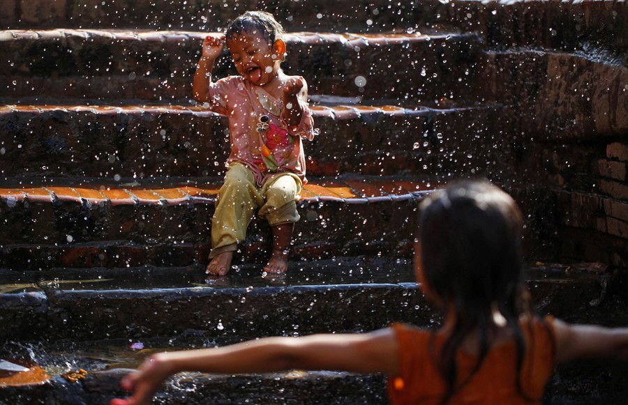 Read moreA boy reacts as his sister splashes water from a stone spout near Bangalamukhi temple in Katmandu, Nepal, on August 28, 2012. There are dozens of centuries-old stone spouts that are still used to collect household water or as public bathing spots in the city. #