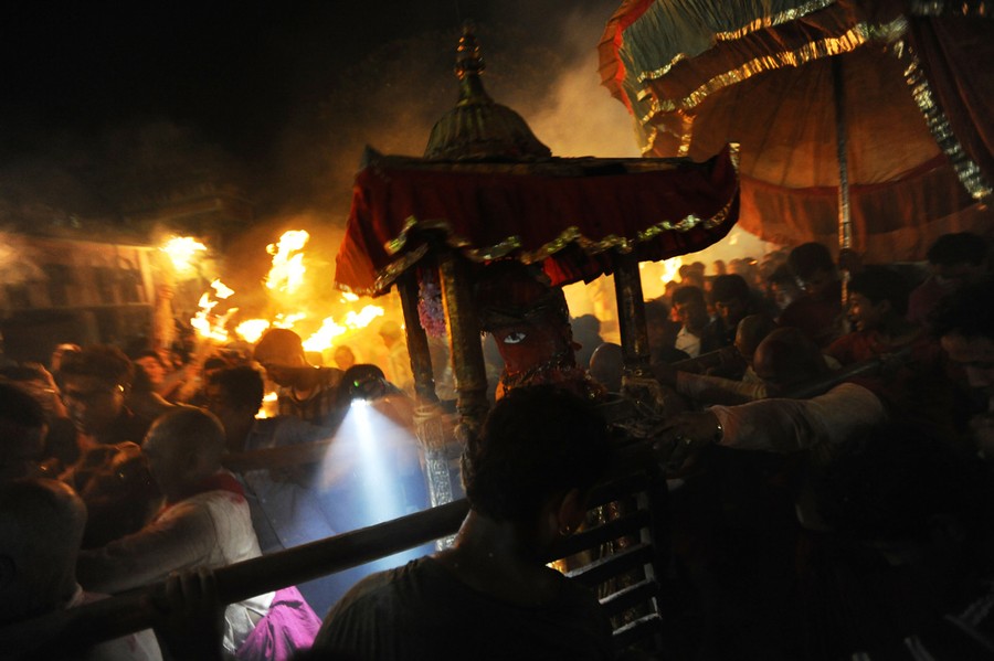 Read moreDevotees gather to watch a chariot procession of Nepal's living goddess during the Indra Jatra festival in Kathmandu on September 29, 2012. During the week-long festival, which marks the end of the monsoon season and celebrated by both Hindus and Buddhists, Nepal's living goddess is taken around the main parts of Kathmandu in a wooden chariot pulled by supporters. #