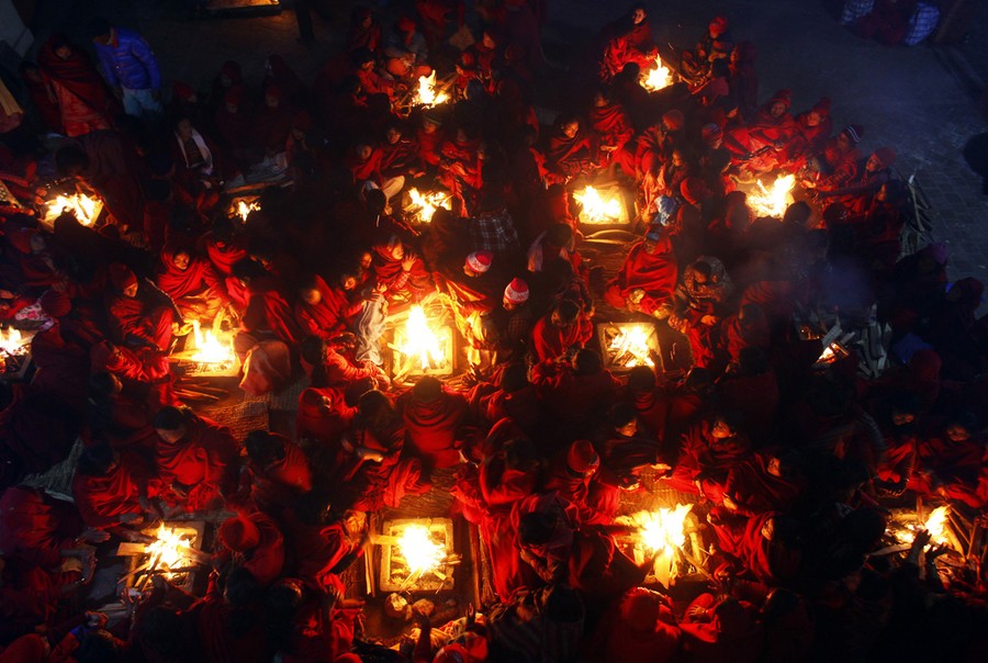 Read moreNepalese Hindu women warm themselves before taking a holy bath in Salinadi River during the first day of Madhav Narayan Festival, in Sankhu, Nepal, on January 9, 2012. Hindu women observe a fast and pray to Goddess Swasthani for the longevity of their husbands during the festival. #