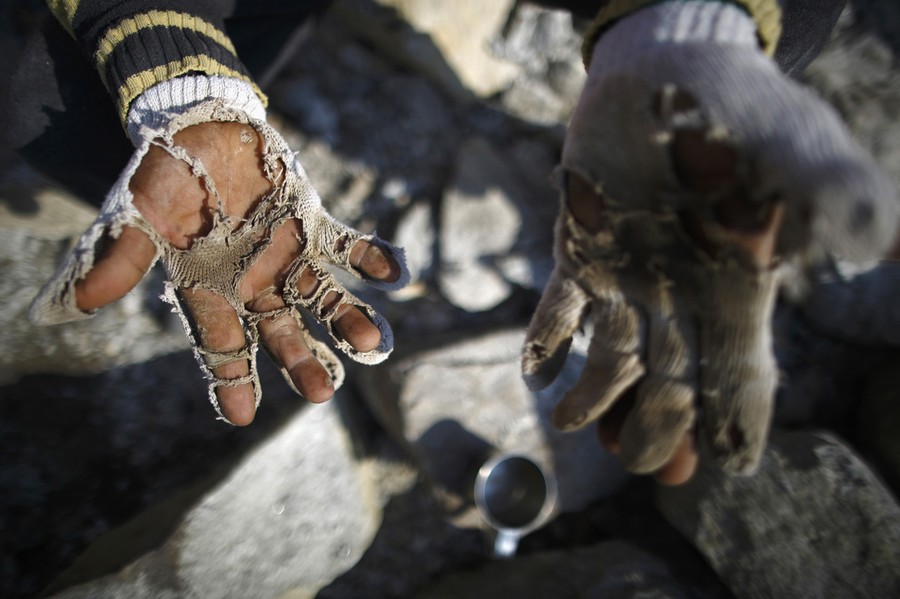 Read moreA construction worker shows his worn gloves as he carves stones while building a hotel in Namche, approximately 3,400 meters above sea level in Solukhumbu District, on April 27, 2014. #