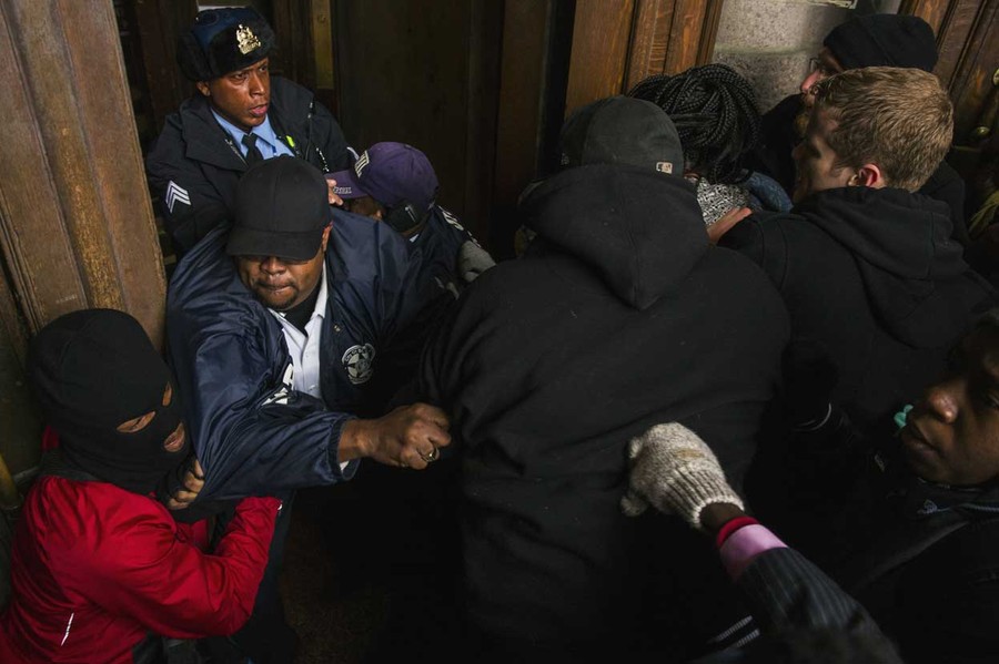 Read moreA City Marshal tries to stop a group of protesters from entering St. Louis City Hall in St. Louis, Missouri, on November 26, 2014. The group was marching in protest of the grand jury decision on the killing of Michael Brown. #