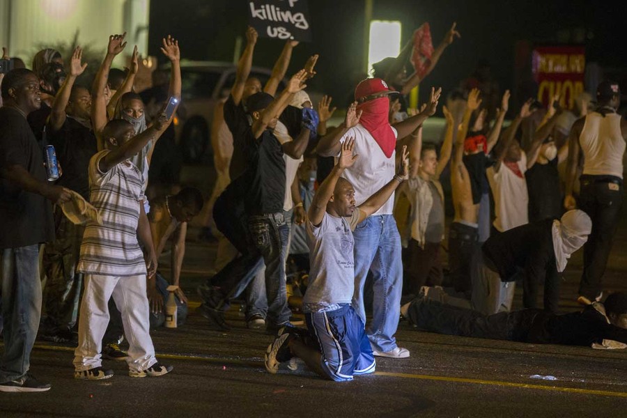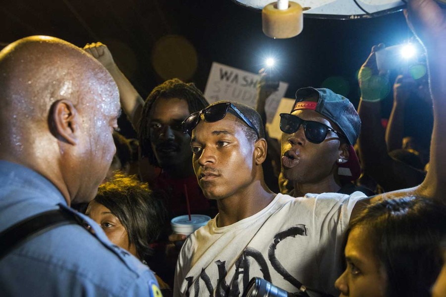 Read moreMissouri State Highway Patrol Captain Ron Johnson (left) speaks to protesters as he walks through a peaceful demonstration as communities continue to react to the shooting of Michael Brown in Ferguson, Missouri, on August 14, 2014. #