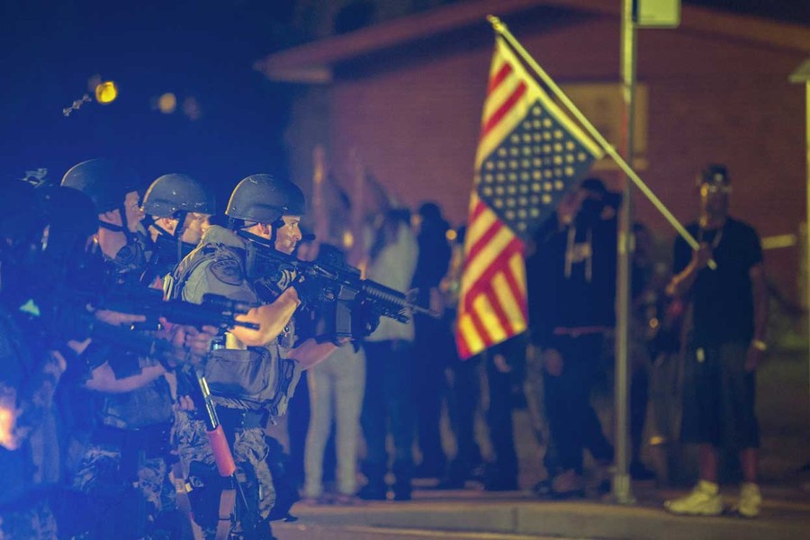 Read morePolice officers and National Guard soldiers watch protesters gathered to demand justice for the killing of 18-year-old Michael Brown, outside the Ferguson Police Department in Ferguson, Missouri, on November 28, 2014. #