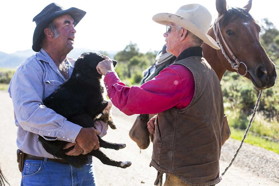 Read moreRancher Steve Pargin (left) holds a young border collie that cowboy David Thompson had brought to him while they prepare to gather cattle near Ignacio, Colorado, on June 10, 2014. The land where the cattle graze is leased from the Forest Service by third-generation rancher Steve Pargin. #