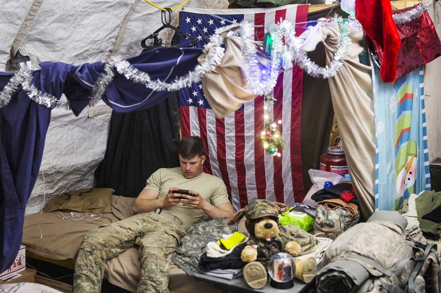 Read moreA U.S. soldier from the 3rd Cavalry Regiment relaxes in his quarters after taking part in a mortar exercise on forward operating base Gamberi in the Laghman province of Afghanistan on December 24, 2014. #