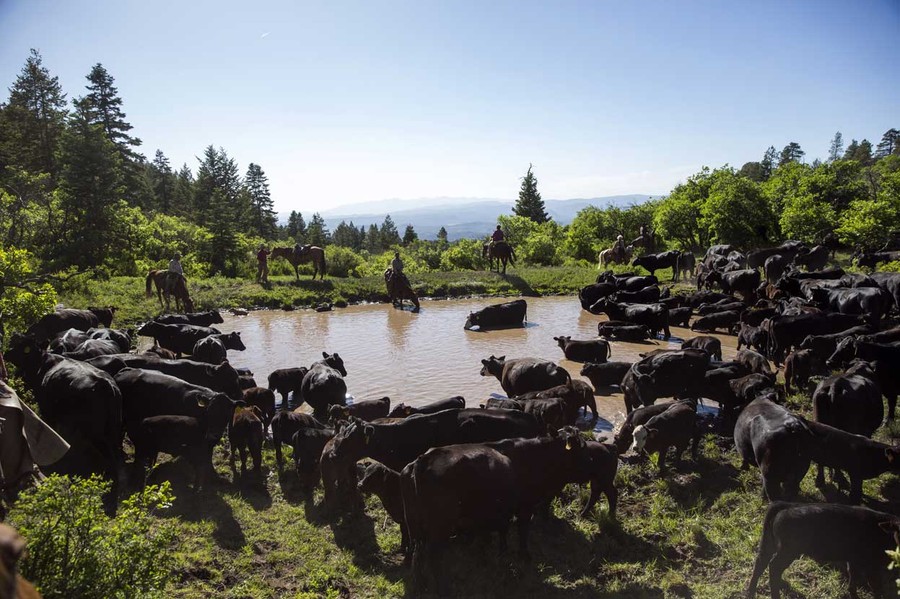 Read moreCattle cool down and drink water at a man-made reservoir in the mountains near Ignacio, Colorado, on June 11, 2014. Several times a year, rancher Steve Pargin and a crew led by his head cowboy, David Thompson, spend a week or more herding cattle from mountain range to mountain range to prevent them from causing damage to fragile ecosystems by staying in a single area too long. #