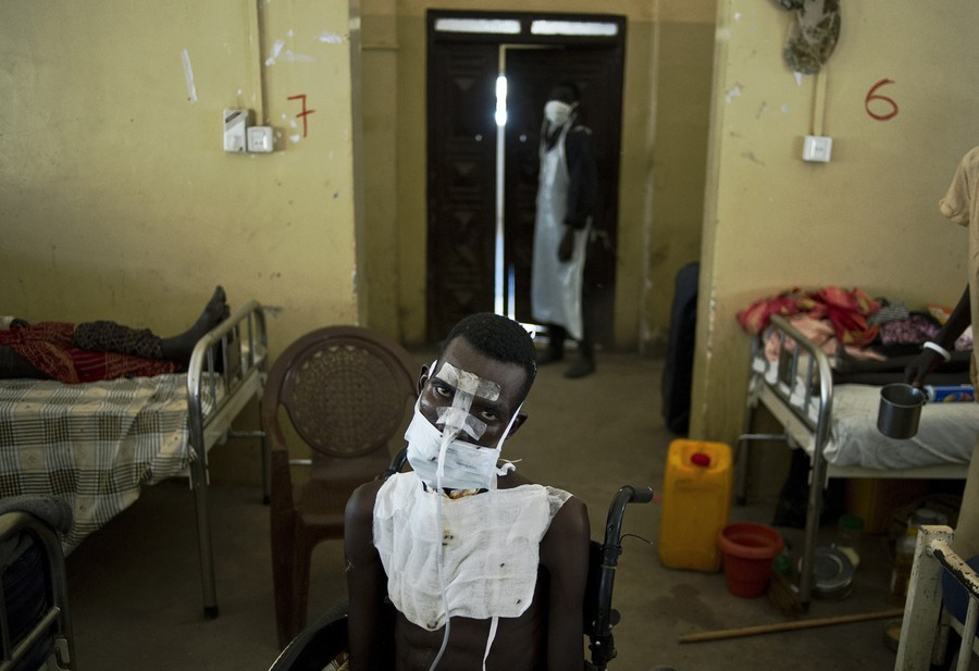 Read moreA patient being treated for multiple gunshot wounds to the face, chest and throat sits in a wheelchair in the Malakal teaching hospital in South Sudan on February 5, 2014. Recent fighting in the country has seen waves of brutal revenge attacks, as fighters and ethnic militia use the violence to loot and settle old scores, with the United Nations and rights workers reporting that horrific atrocities have been committed by both sides. #