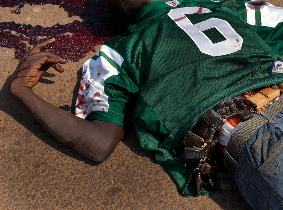 Read moreA man lies dead at a checkpoint wearing lucky charms around his waist following a shootout with Congolese peacekeepers, in Bangui, Central African Republic, on December 20, 2013. Three bodies lay baking in the sun at the checkpoint after being shot by Congolese peacekeepers, who said the men had attacked them. After a period of relative calm, violence flared anew in the Central African Republic, with angry demonstrations against Chadian peacekeepers, shootouts at checkpoints, and the destruction of a mosque. #