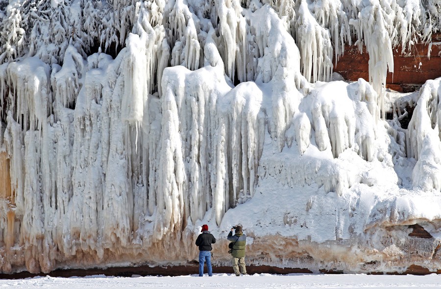 Read moreSightseers look at a frozen rock face along the Apostle Islands National Lakeshore of Lake Superior, the world's largest freshwater lake, near Cornucopia, Wisconsin, on February 14, 2014. According to the National Oceanic and Atmospheric Administration (NOAA) Great Lakes Environmental Research Laboratory, about 94% of Lake Superior was covered with ice at the time, enabling thousands of people to visit the islands on foot for the first time since 2009. #