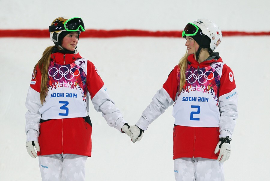 Read moreSilver medalist Chloe Dufour-Lapointe of Canada (left) and her sister, gold medalist Justine Dufour-Lapointe of Canada hold hands during the flower ceremony following the Ladies' Moguls Final 3 at Rosa Khutor Extreme Park, on February 8, 2014. #