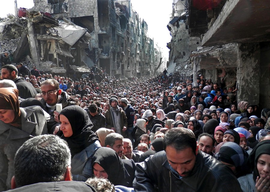 Read moreResidents of the besieged Palestinian camp of Yarmouk, queuing to receive food supplies, in Damascus, Syria, on January 31, 2014. At the time, a United Nations official called on warring sides in Syria to allow aid workers to resume distribution of food and medicine in a besieged Palestinian district of Damascus, devastated by Syria's 3-year-old conflict. #