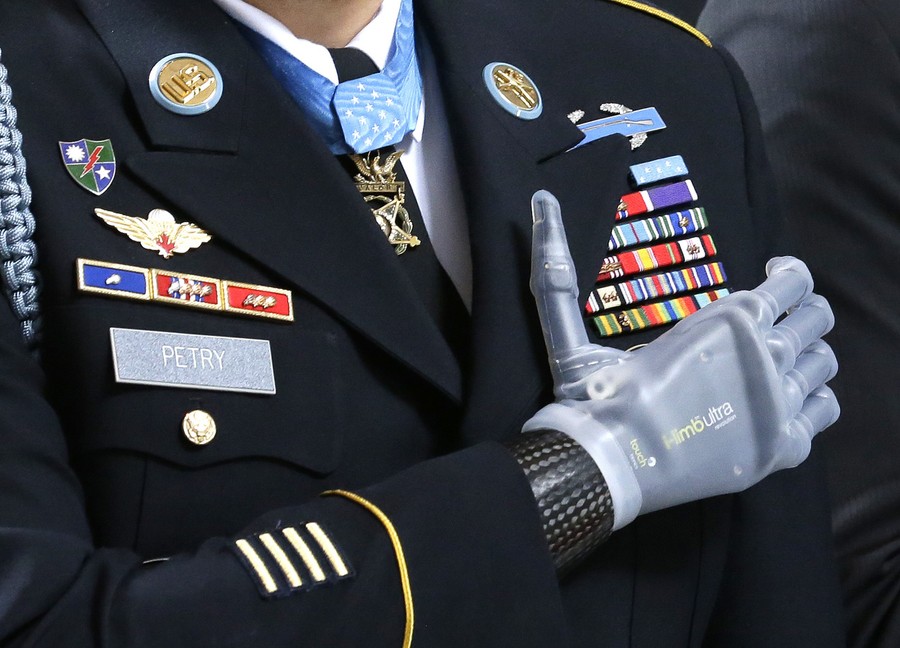 Read moreMedal of Honor recipient Sgt. 1st Class Leroy Petry stands with his prosthetic hand over his heart, wearing his Medal of Honor during the Pledge of Allegiance at the Capitol in Olympia, Washington on April 2, 2014, during a ceremony to honor him and other recipients of the Medal of Honor from Washington state. Petry lost his hand in 2008 when an enemy grenade he was throwing away from fellow soldiers detonated while in combat in Afghanistan. #