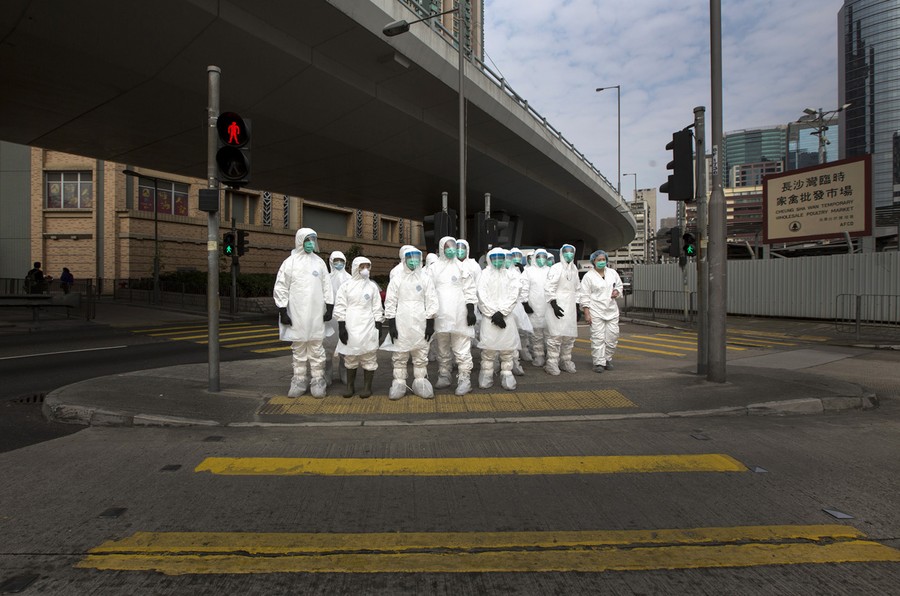 Read moreHealth officers in full protective gear wait to cross a road near a wholesale poultry market in Hong Kong on January 28, 2014. Hong Kong began culling 20,000 chickens and suspended imports of fresh poultry from mainland China for 21 days on Tuesday after the discovery of the H7N9 bird flu virus in a batch of live chicken from the southern province of Guangdong. #
