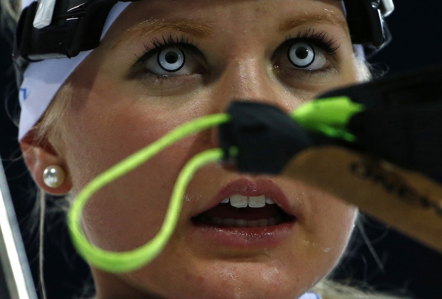 Read moreEstonia's Grete Gaim, wearing colored contact lenses, after crossing the finish line during the women's biathlon 7.5km sprint event in Rosa Khutor, on February 9, 2014. #