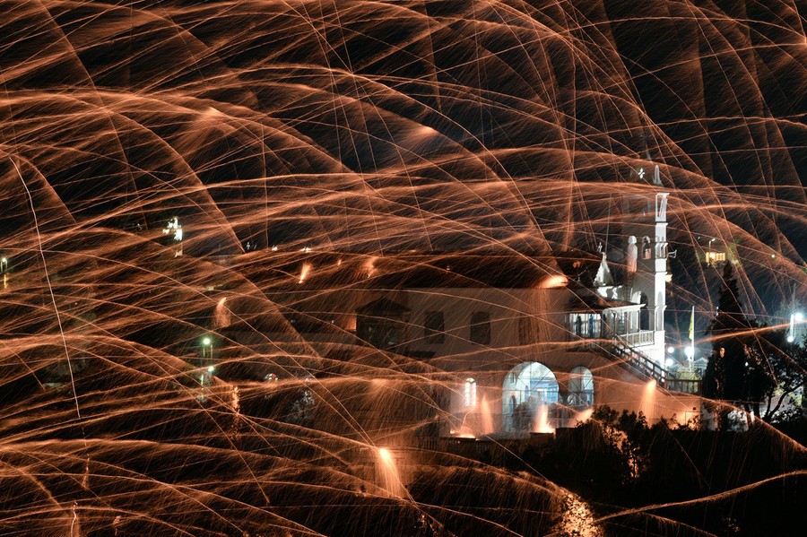Read moreHomemade rockets streak through the sky above Vrontados, Greece, on April 19, 2014. Two rival parishes of Vrontados village fire thousands of rockets every Easter Saturday aiming at the opposing church's bell tower in a centuries-old tradition. #