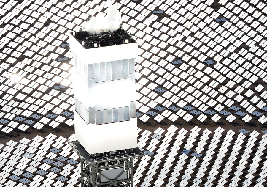 Read moreAn aerial view of a solar receiver and boiler atop a tower at the Ivanpah Solar Electric Generating System (SEGS) in the Mojave Desert in California near Primm, Nevada, on February 20, 2014. The largest solar thermal power-tower system in the world, owned by NRG Energy, Google and BrightSource Energy, opened in January in the Ivanpah Dry Lake and uses 347,000 computer-controlled mirrors to focus sunlight onto boilers on top of three 459-foot towers, where water is heated to produce steam to power turbines providing power to more than 140,000 California homes. #