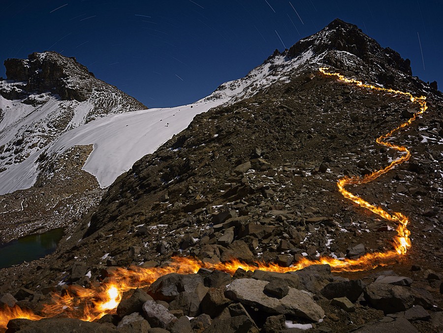 Read moreWhen I Am Laid In Earth, 1. Mapping with a pyrograph, the melting away of the Lewis Glacier on Mt. Kenya. One of a series of fire lines I have drawn indicate where the front of the rapidly disappearing Lewis Glacier was at various times in the recent past. In the distance, a harvest moon lights the poor, doomed glacier remnant; the gap between the fire and the ice represents the relentless melting. #