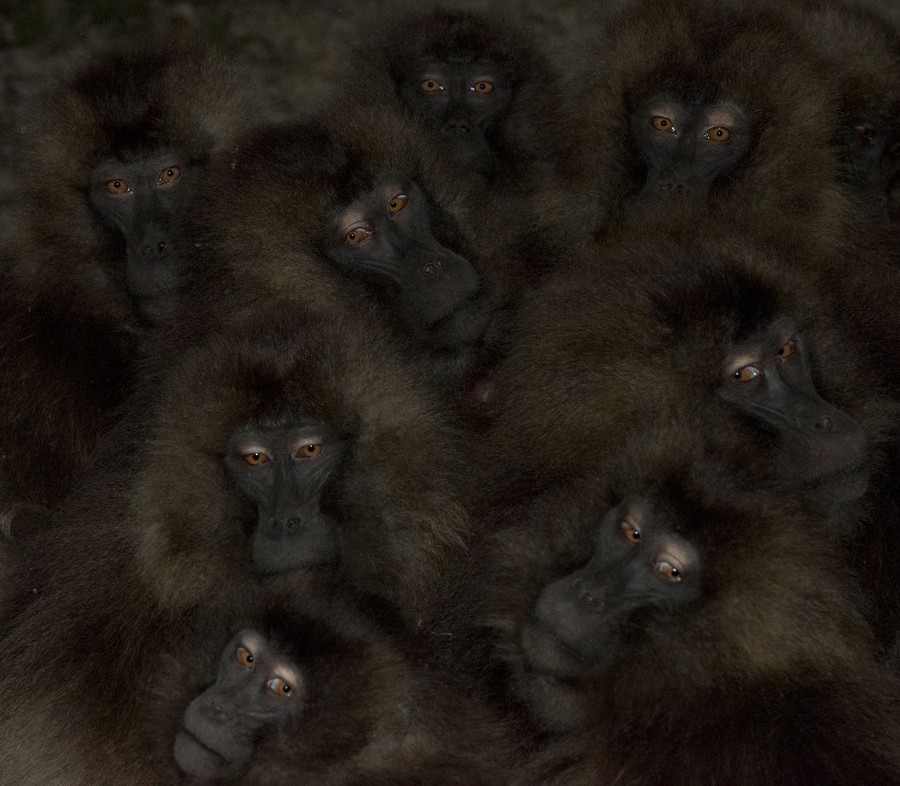 Read moreCommunal warmth: About an hour before sunset, Simone set up at the edge of a cliff, high in the Simien Mountains of Ethiopia, where he knew a group of geladas would return after a day’s foraging on nearby grasslands. Geladas are the last surviving species of a once widespread group of grass-grazing primates, now confined to certain spots in the Ethiopian highlands, threatened by the loss of their grasslands and competing with livestock for grazing. The troop arrived on cue, and as the sun set and the cold night loomed, the monkeys disappeared over the cliff to find a safe place to sleep where they could huddle together for warmth. Simone leant over, balancing against a rock to get as close as possible without falling. By now, it was almost completely dark, and so he increased his ISO setting to maximum, used a gentle pulse of flash and focused straight down the cliff, capturing just one graphic composition of these close-knit characters. #