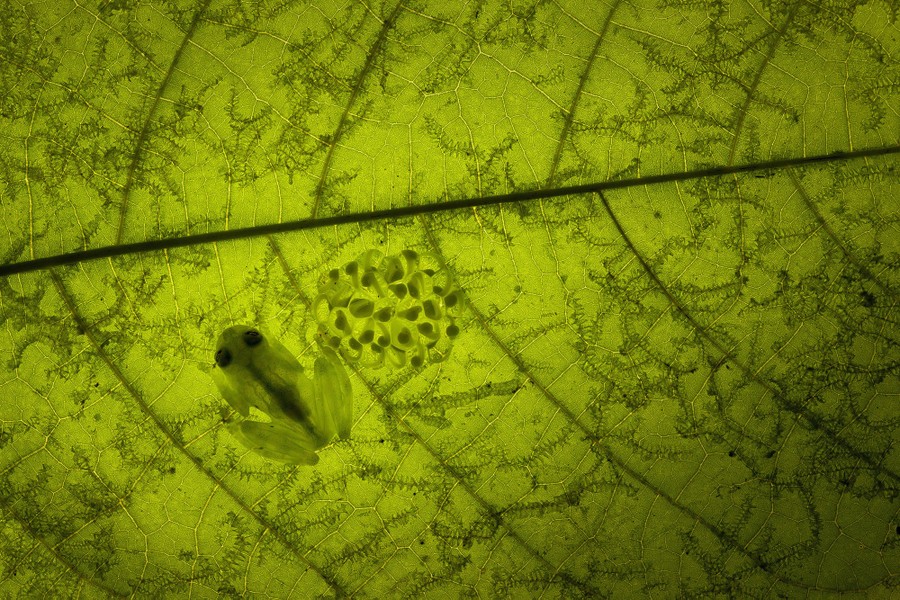 Read moreTransparent care: A beam of sunlight shines down through a leaf and through the translucent skin of a tiny male reticulated glass frog clinging to its underside. He is guarding a clutch of maturing eggs, stuck to each other and to the leaf with jelly, and he will guard them for two weeks, until the tadpoles hatch and drop into the stream below. Males will wrestle other males in defence of their patches and in their attempts to attract females to their spawning leaves. They will also fend off predatory wasps intent on taking the eggs. The behaviour of glass frogs and their transparency have always fascinated Ingo and inspired his trip to Costa Rica in search of them. Transparency is the perfect camouflage, but Ingo managed to find a number of brooding males clinging to leaves beside a small stream in the Piedras Blancas National Park, some guarding several clutches, and with the aid of a ladder, he got his shots. #